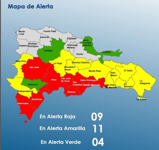 A primera hora de la mañana del 22 de octubre, el COE mantiene 8 provincias y el Distrito Nacional en alerta roja y 11 en amarilla y 4 en verde, debido a que el informe del INDOMET, establece que la tormenta tropical Melissa, No. 13 de la presente temporada, se encuentra aproximadamente a unos 495 kilómetros al sur/suroeste de Puerto Príncipe (Haití).