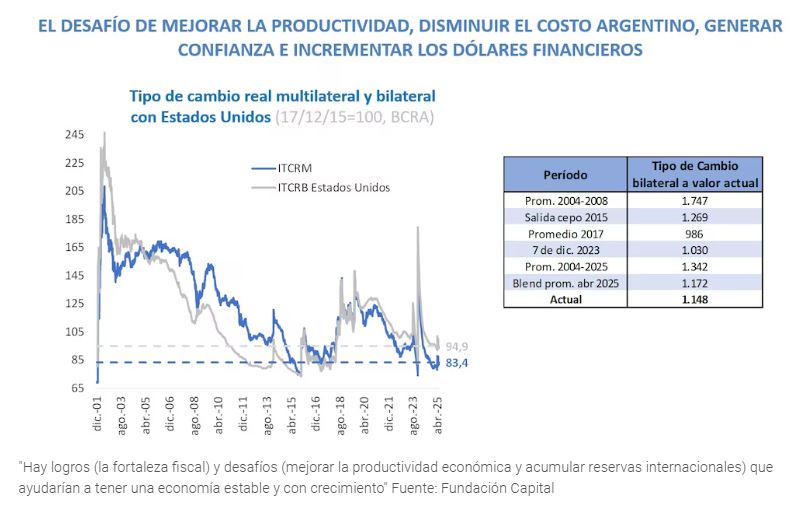 — Buen punto, no es la variable exclusiva. Sí es una referencia a tener en cuenta. Es muy importante que se avance rápidamente en la disminución de los costos impositivos, laborales, de financiamiento y de infraestructura, para que la serie histórica de tipo de cambio real vaya perdiendo relevancia. No es sustentable un tipo de cambio real bajo con una también baja productividad económica.