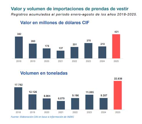 El principal dato informó que las importaciones de prendas de vestir alcanzaron los USD 421 millones durante los primeros ocho meses de 2025, el doble que en el mismo lapso de 2024. Esta cifra ilustró un crecimiento marcado en el flujo de productos desde el exterior, acompañada de un aumento en el volumen de toneladas ingresadas.