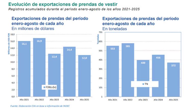 Entre enero y agosto, el país exportó por USD 12 millones en prendas, lo que representa una caída del 17% frente al año anterior. Las cantidades exportadas sumaron 372 toneladas, una baja interanual del 19 por ciento.