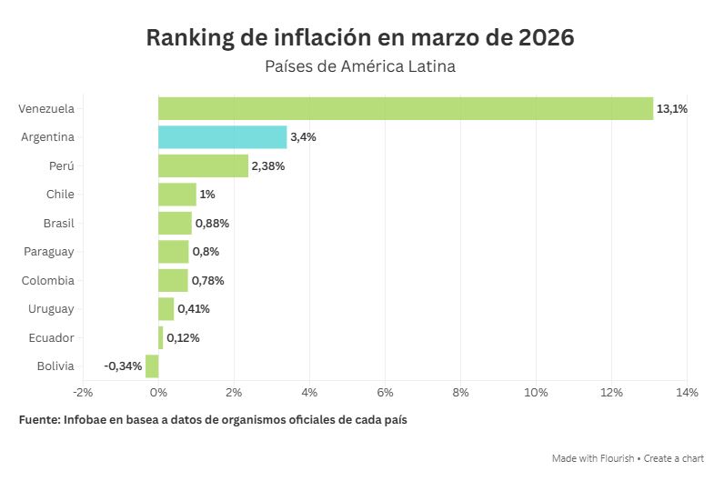En el primer puesto del ranking regional de inflación se encuentra Venezuela. Según las mediciones del Banco Central de Venezuela, el país caribeño registró un 13,10% de inflación mensual en marzo. Esta cifra lo consolida como el caso más crítico de la región, acumulando en el primer trimestre de 2026 un alza de precios del 71,80%. La dinámica venezolana sigue operando en una escala completamente diferente a la de sus vecinos, manteniendo niveles de dos dígitos mensuales de manera persistente.