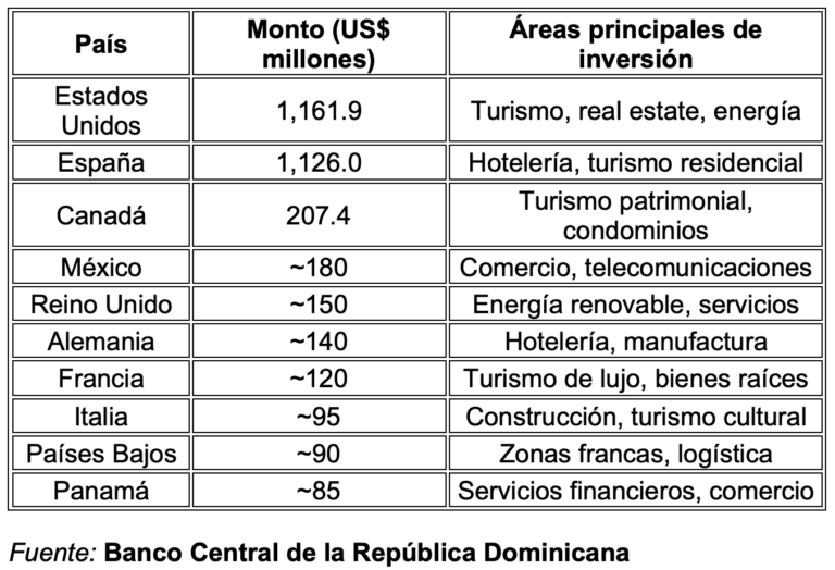 Los flujos de inversión se distribuyeron principalmente en áreas turismo (26.3 %): Resorts, hotelería y proyectos de real estate turístico. Energía (23.8 %): Expansión de parques solares y proyectos de generación limpia. Bienes raíces (15.7 %): Residencias turísticas y desarrollos urbanos. Comercio y Zonas Francas: Manufactura y exportación. Minería y financiero: Aportes más modestos pero constantes.