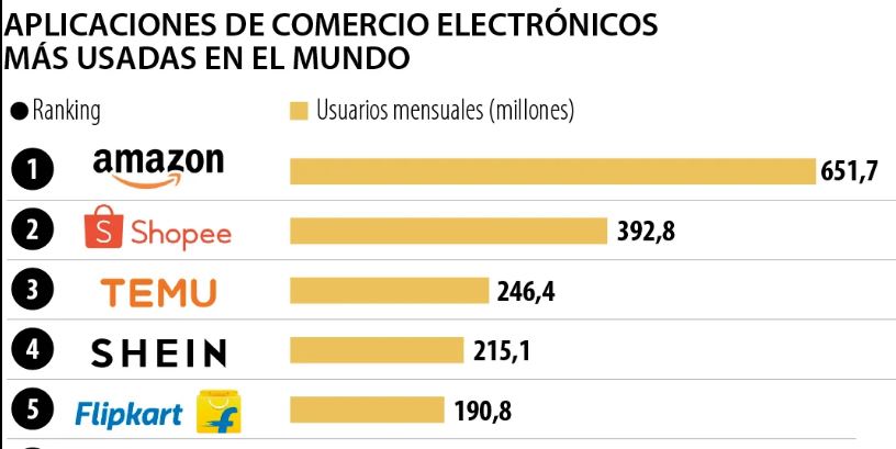 El primer puesto fue para Amazon con un promedio de usuarios mensuales de 651,7 millones; el segundo lugar fue ocupado por Shopee con 392,7 millones y el podio fue completado por Temu con 246,4 millones.